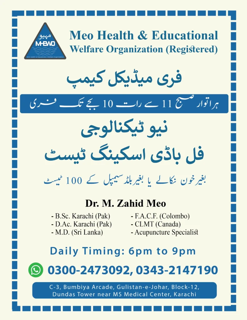 Dr. Zahid Meo is a well-known Medical Technologist, healthcare innovator, and humanitarian who has dedicated more than 40 years of his life to serving others. He is the founder and chairman of the Meo Health & Educational Welfare Organization (MHEWO), a non-profit focused on providing free healthcare and educational support to underserved communities in Pakistan.